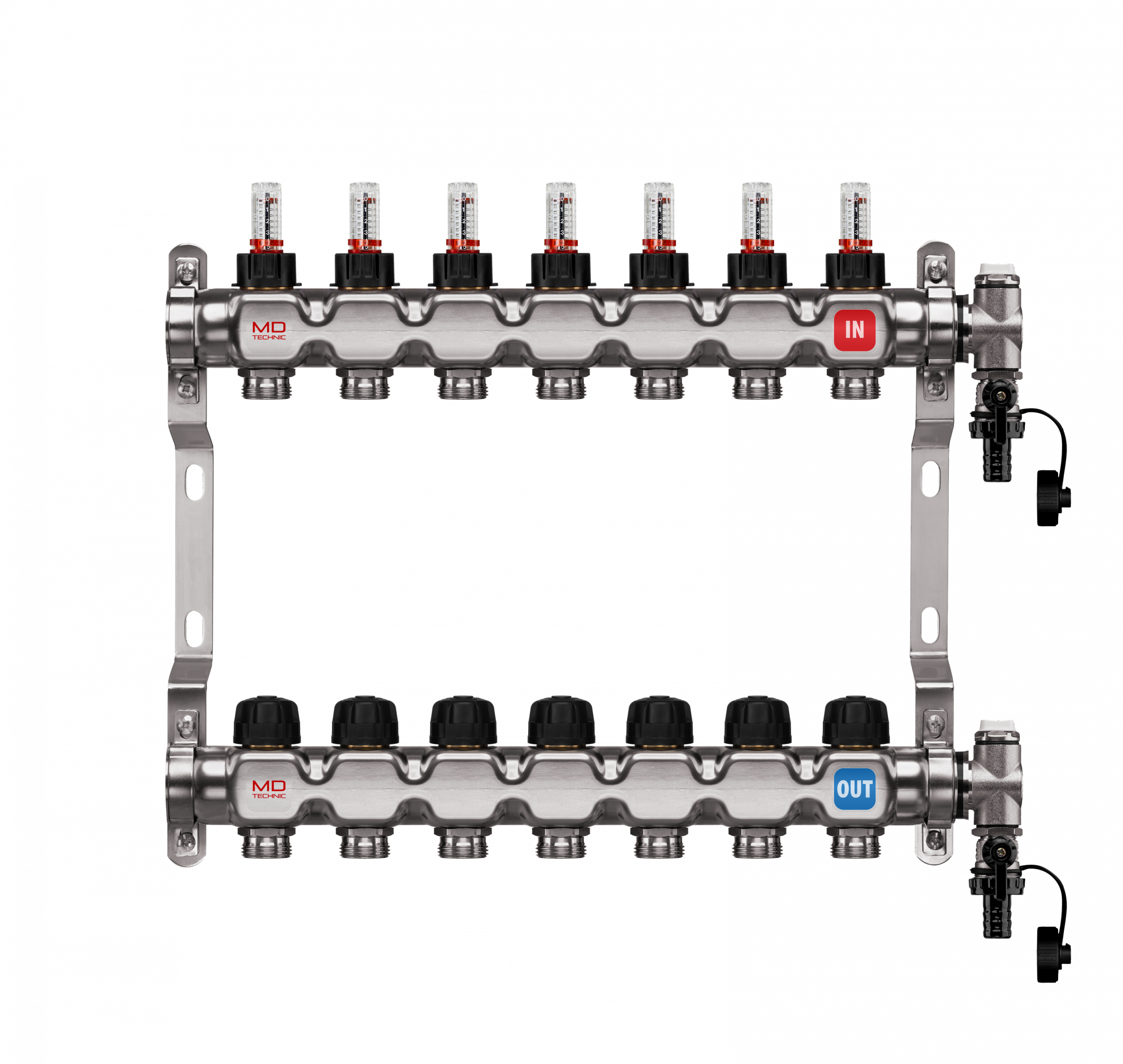 MD Technic Edelstahl-Heizkreisverteiler mit Durchflußmengenmesser und Handventilen. Geeignet zum Einsatz einer Fußboden- Wandheizung bzw. Kühlung.