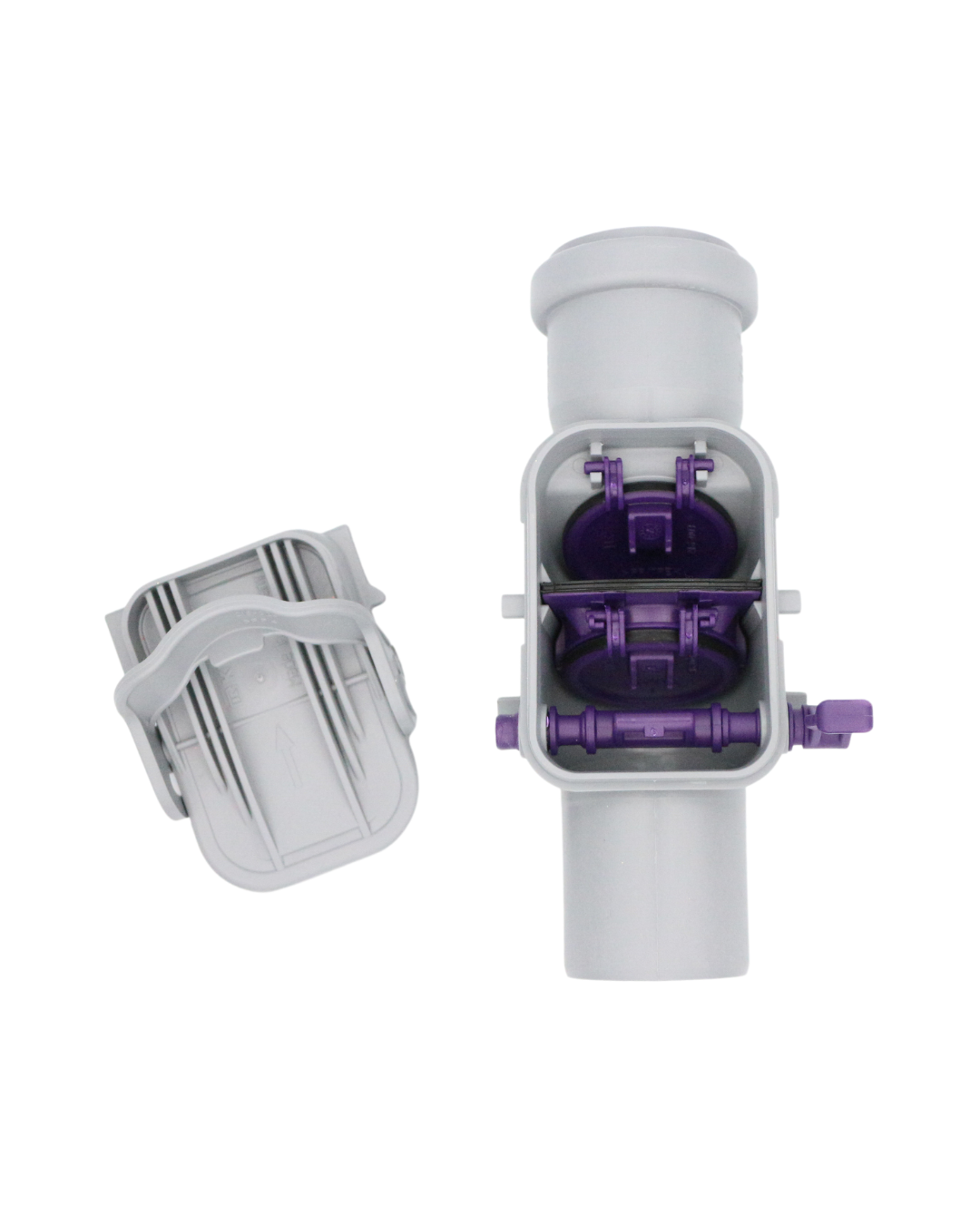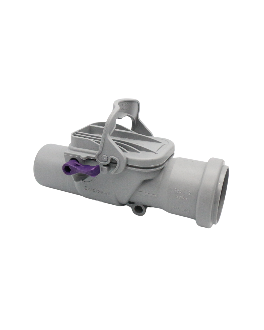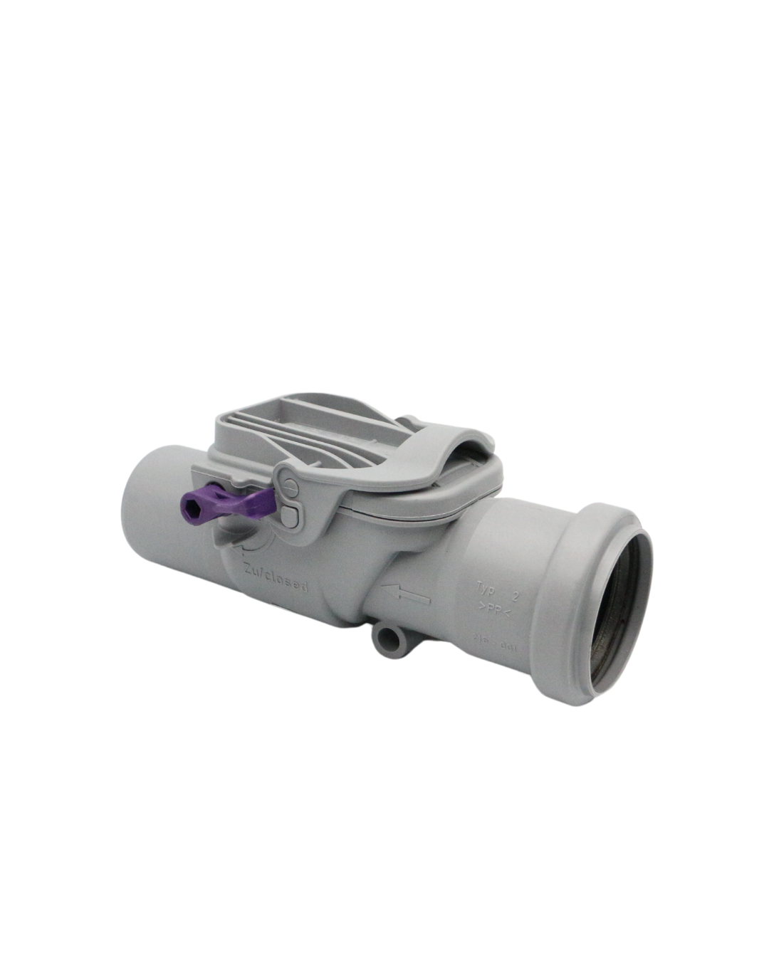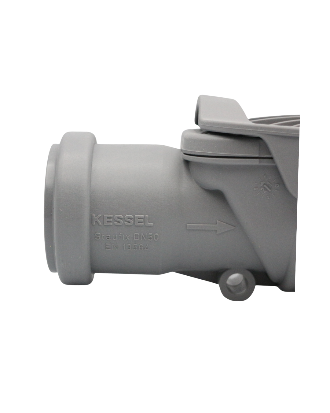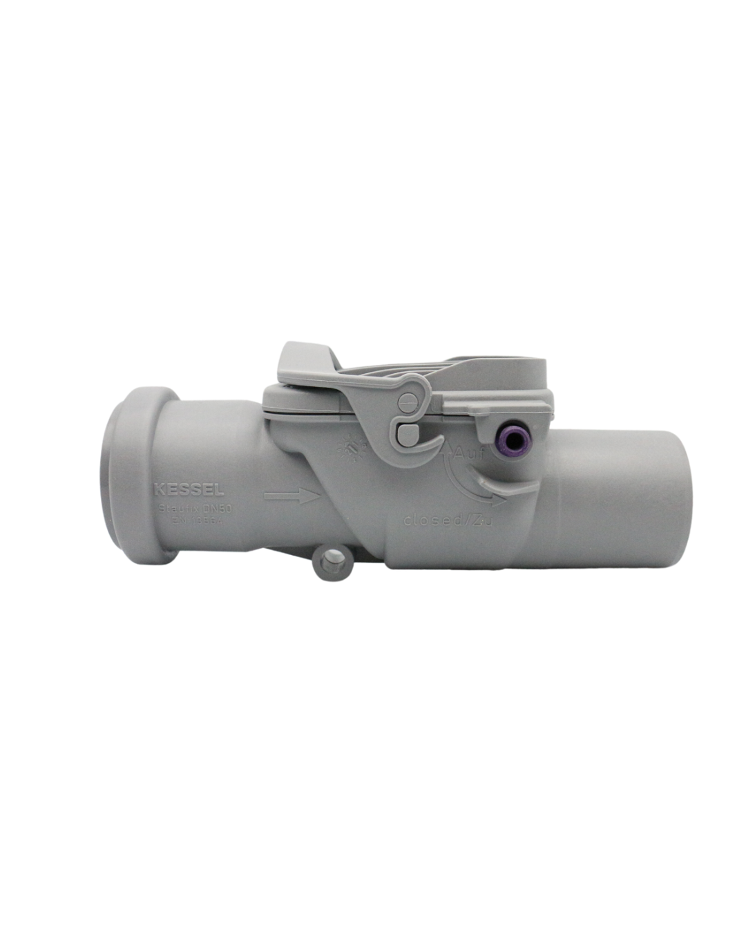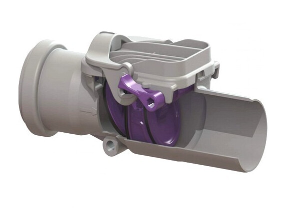 KESSEL-Rückstaudoppelverschluss Staufix DN 50 aus Kunststoff – für freiliegende HT-Leitung – mit zwei selbsttätig schließenden Klappen, eine davon als handverriegelbarer Notverschluss.