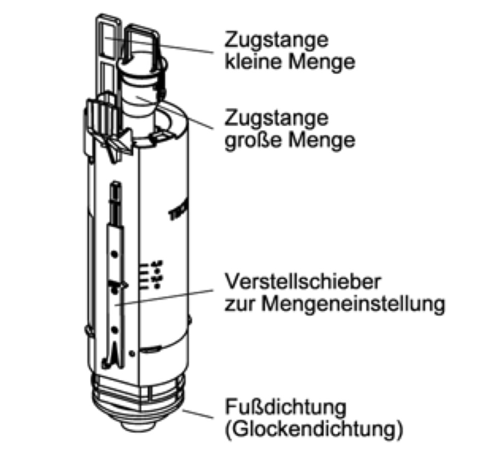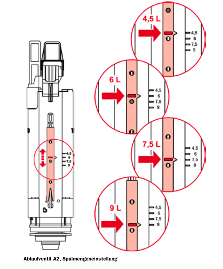 Durch die einfache Einstellbarkeit des Ablaufventils können die Spülmengen den jeweiligen Gegebenheiten angepasst werden. Im Neubausektor bei angepassten Rohrleitungen, Gefällen und bei der Verwendung einer 4,5 Liter-Keramik kann die 4,5 Liter Sparspülung in Kombination mit der 3 Liter Spülung zum Einsatz kommen. Häufig sind jedoch noch Rohrleitungssysteme installiert, die für eine einwandfreie Funktion eine größere Spülmenge benötigen. In diesem Fall können zur Sicherheit Spülmengen bis zu 9 Litern gewählt werden.